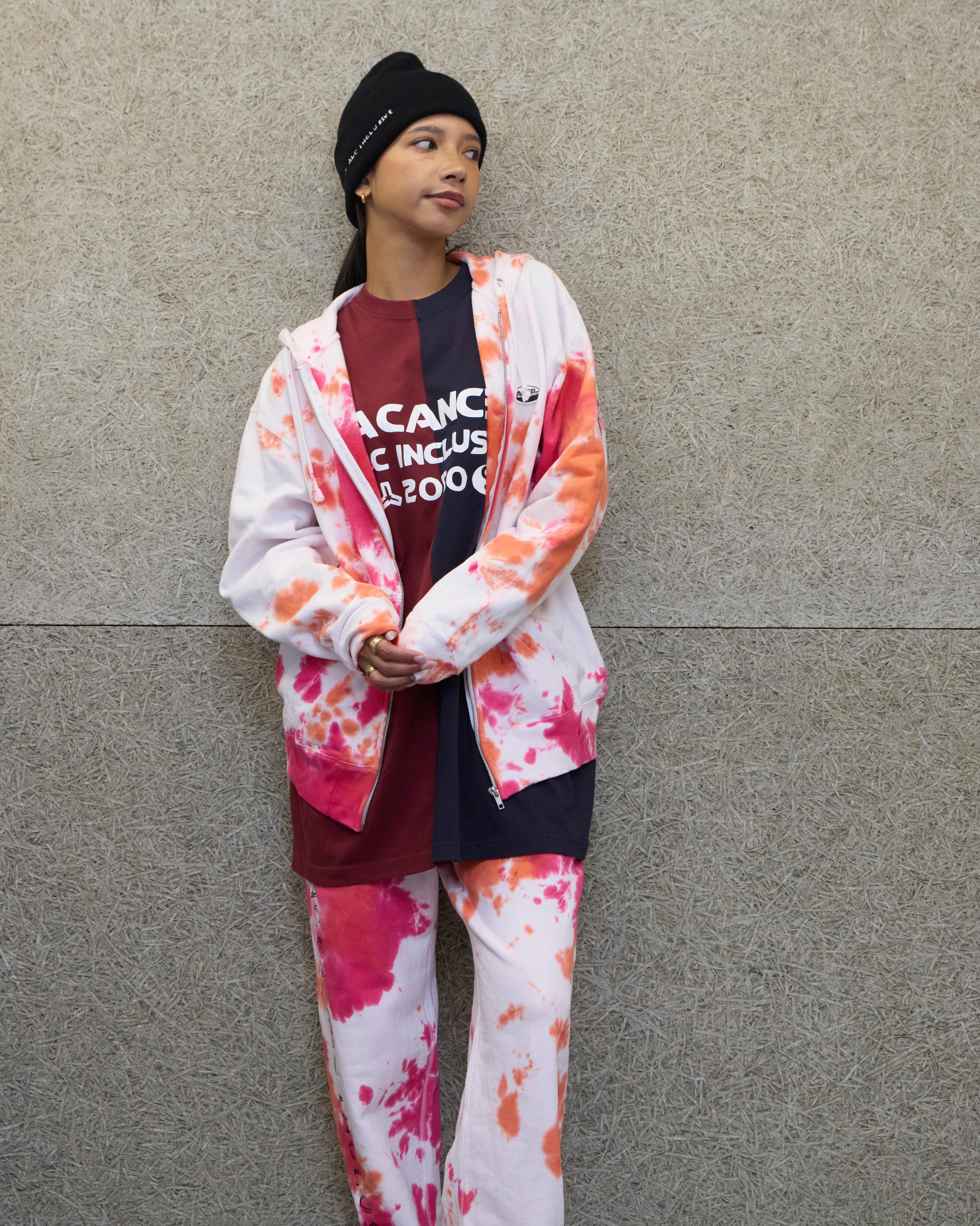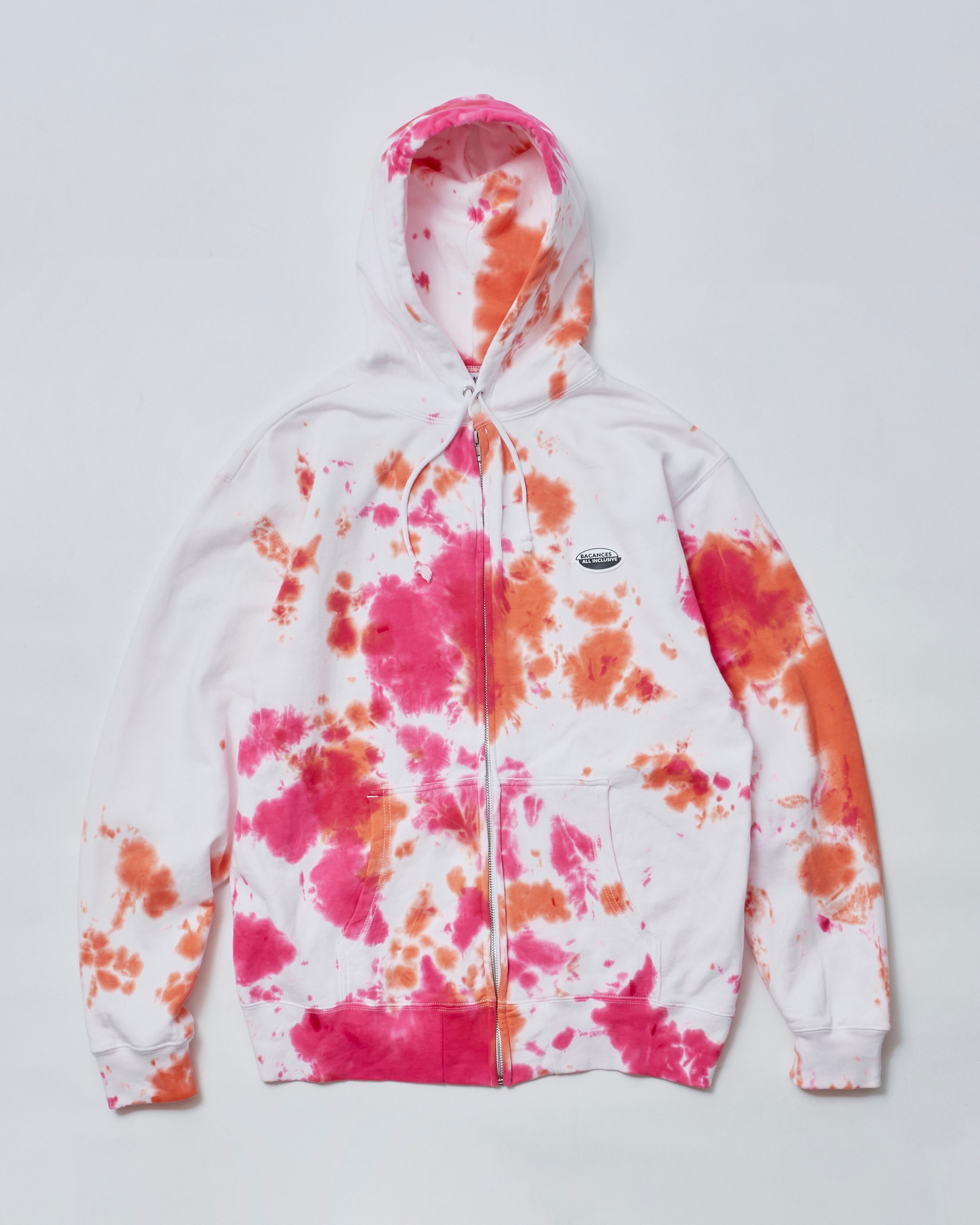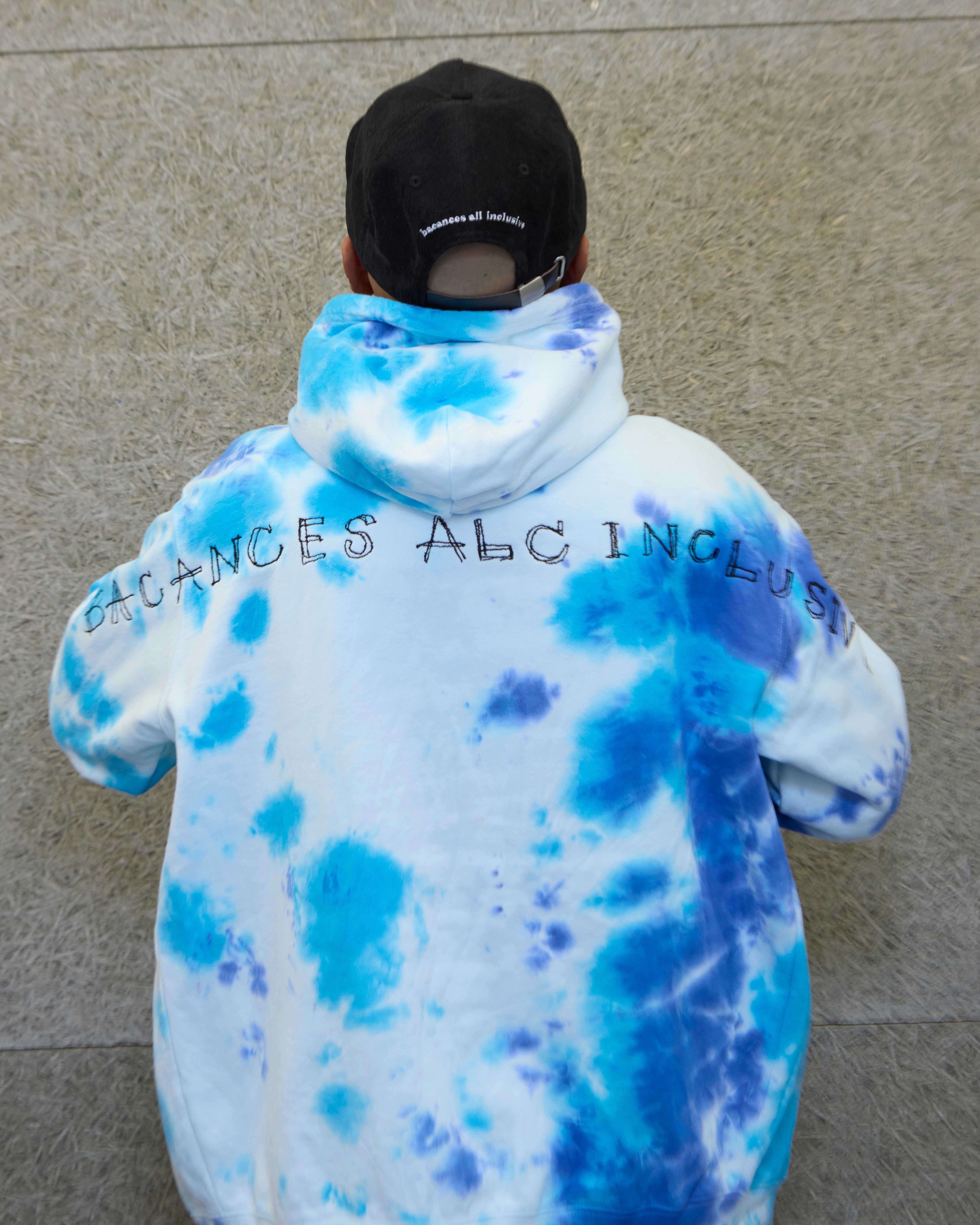 染め職人YUKI DYEによるタイダイ染めのジップパーカー。背面には大きくAlexanderLeeChangデザイナーのLee氏によるドローイングロゴBACANCES “ALC” INCLUSIVEが大きく刺繍された大胆な1枚。